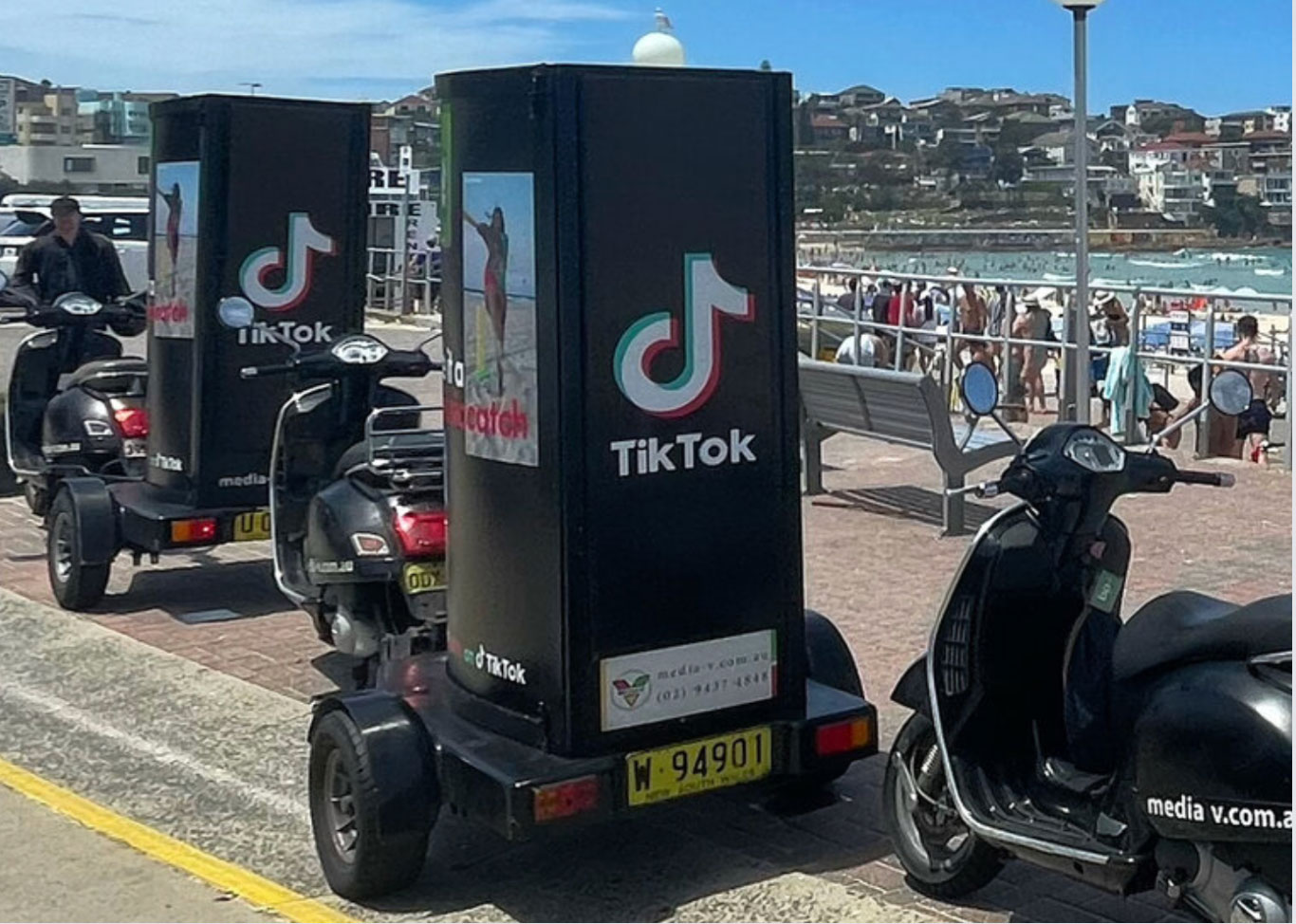 Utilise bikes, scooters, human billboards, and other innovative formats like chalk stencils and magnet bombing around Bondi Beach. Additional tactics include distributing coffee cups and coasters in local cafes, restaurants, and pubs.